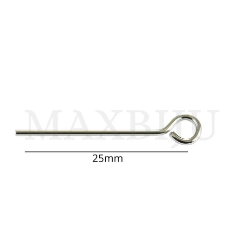 Steel Eye Pins 25mm length and 0.6mm thickness. Quantity per package: - 10g (+/- 145 pieces) silver; - 10 pieces gold...